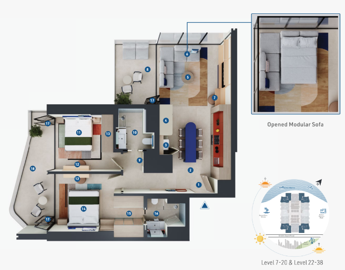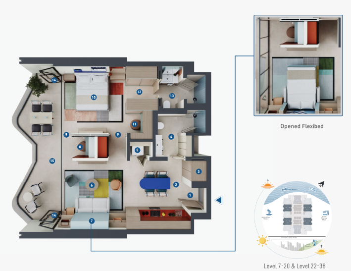 The development features 384 fully furnished studios, 1, and 2-bedroom apartments, each thoughtfully designed to combine modern aesthetics with functionality. High-quality finishes and contemporary interiors provide residents with a comfortable and stylish living environment.